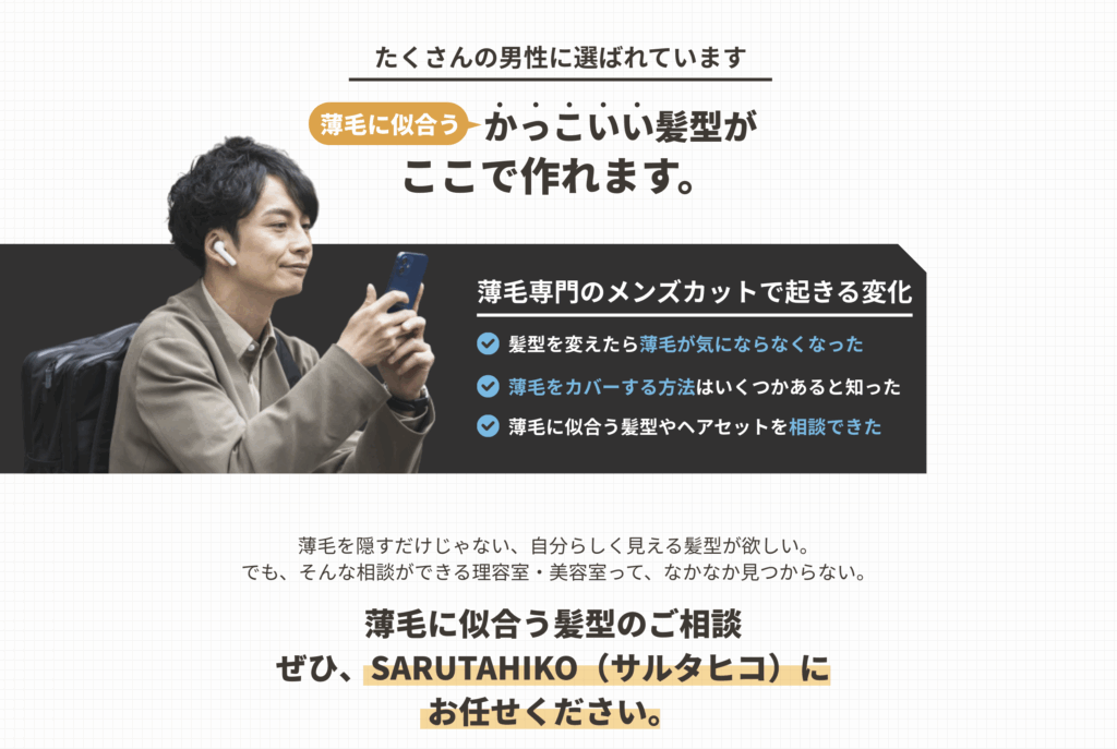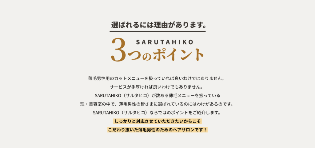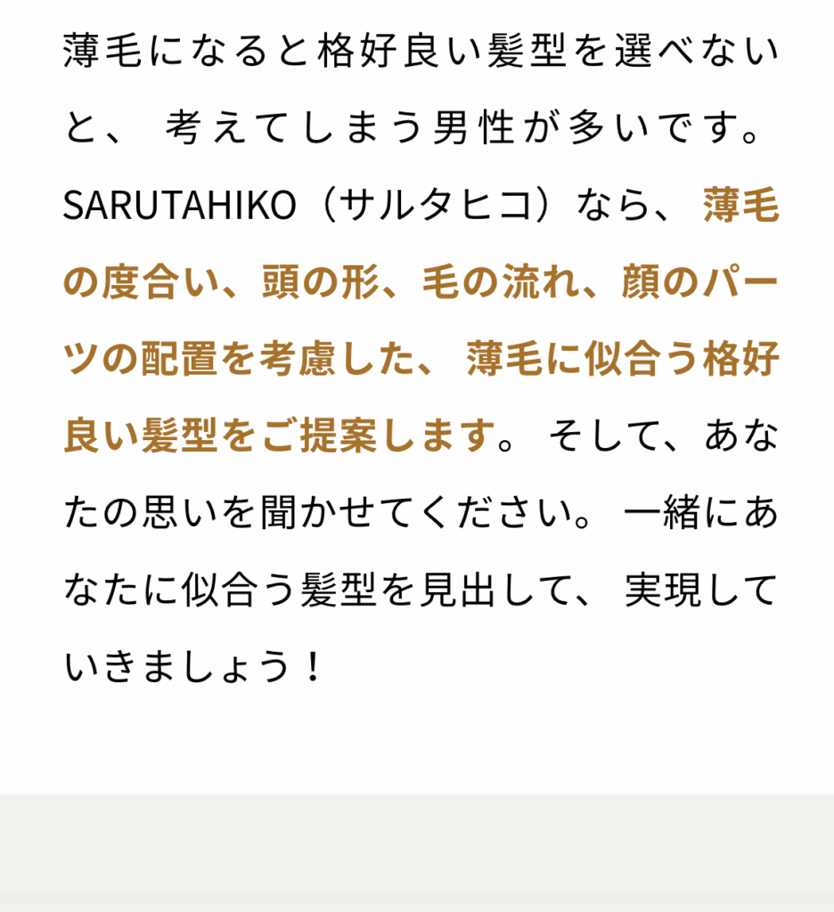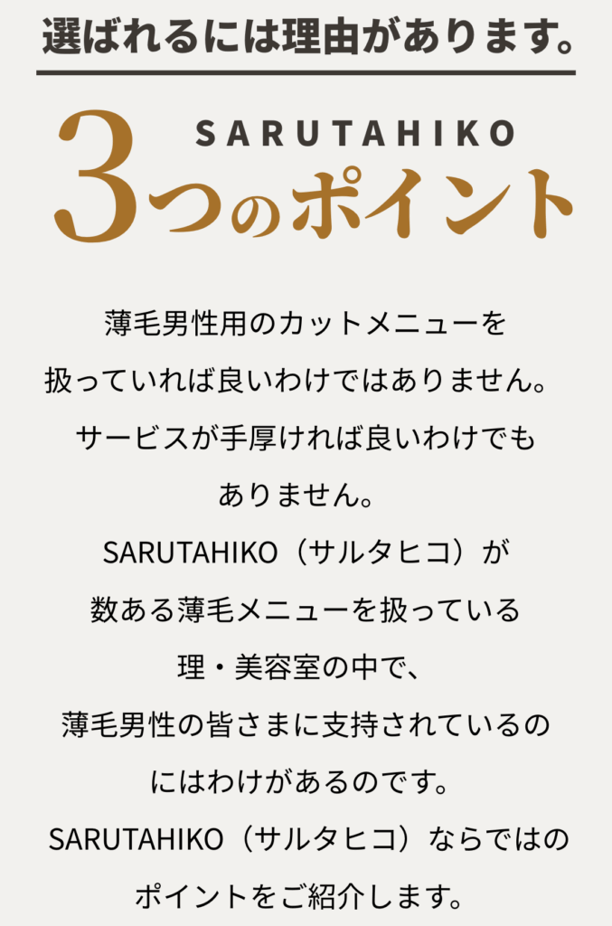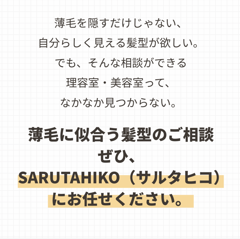 SARUTAHIKO(サルタヒコ)に来たら、薄毛の悩みが解決とまではいかないかもしれないですけど、かなり緩和されます。