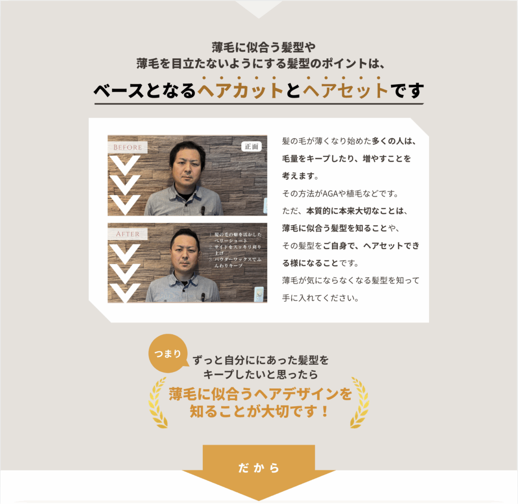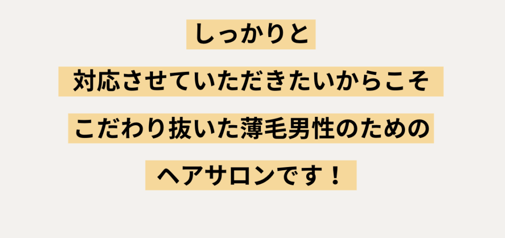 薄毛男性に特化して様々な情報を集め、薄毛男性バーバーという空間でご提供できるサービスを考えました。
