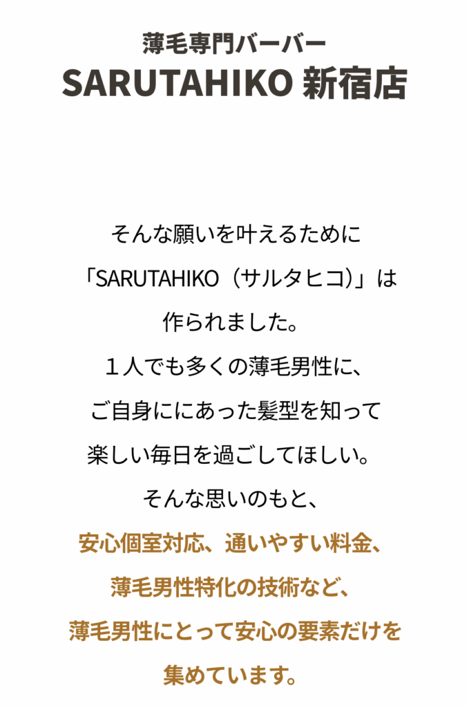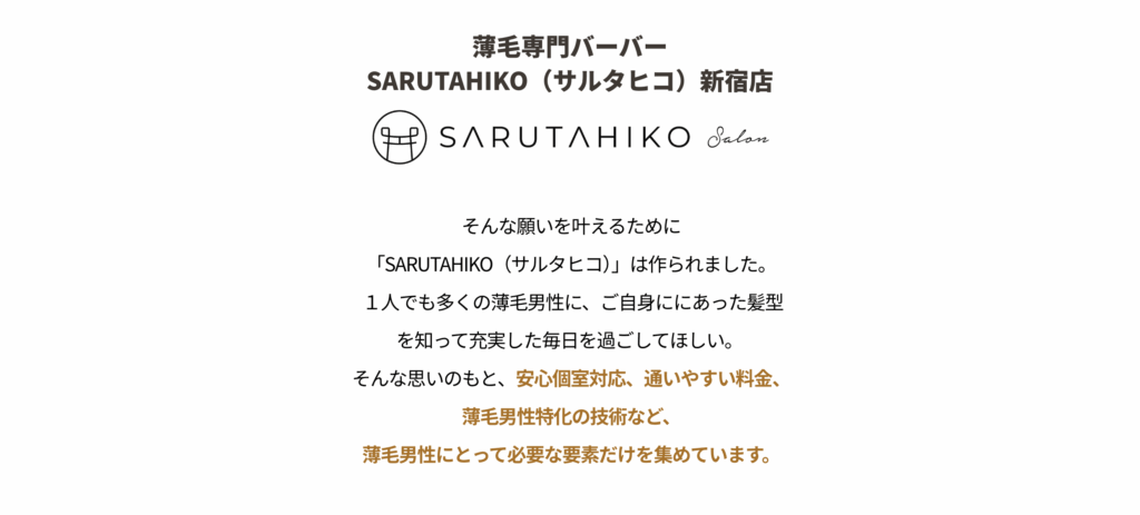 | 店舗名 | 薄毛専門バーバーSARUTAHIKO(サルタヒコ)」新宿店 |