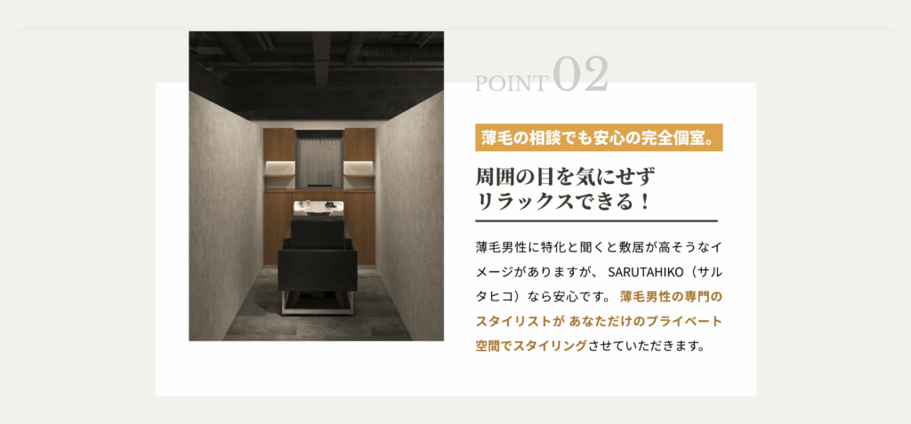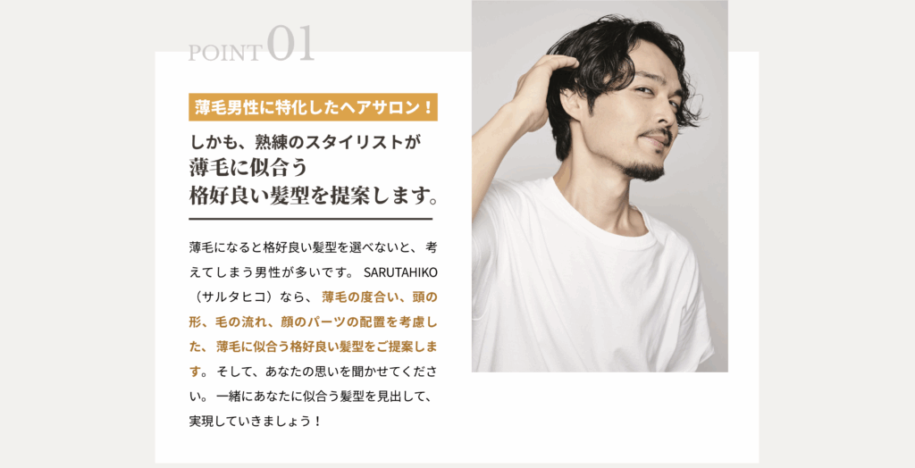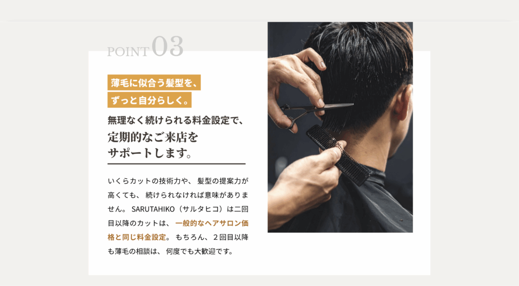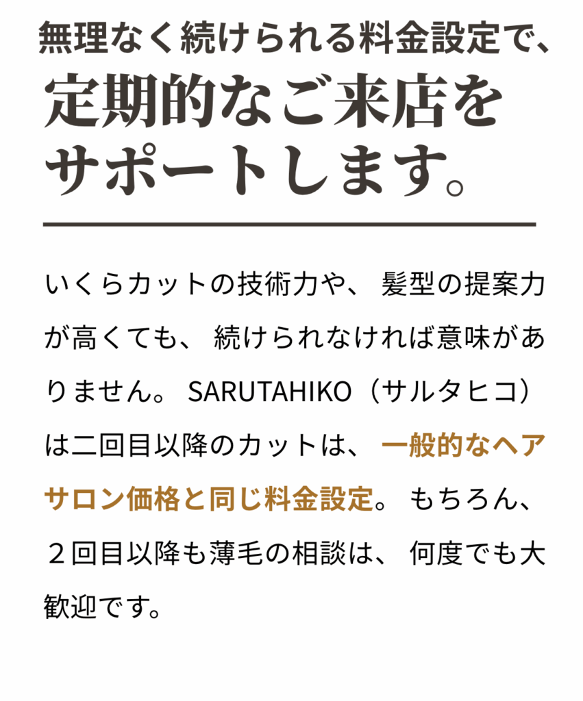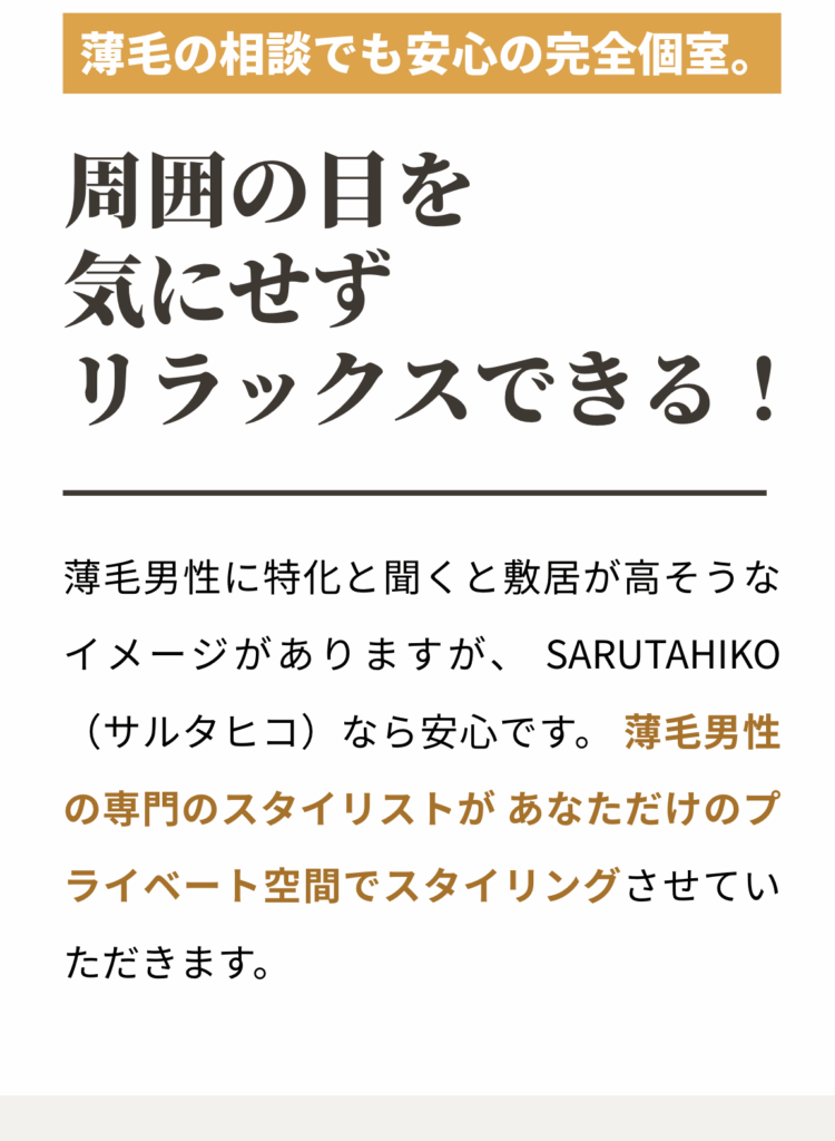 薄毛で美容室に行くのは、ちょっと不安感があるんです。薄毛な人にしか分からないと思うんですが、SARUTAHIKO(サルタヒコ)はそれが前もってうたってあるので、その点、安心してこれたのが良い点です。