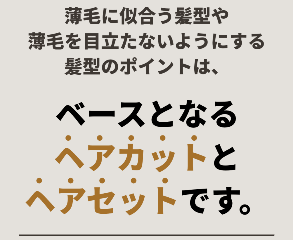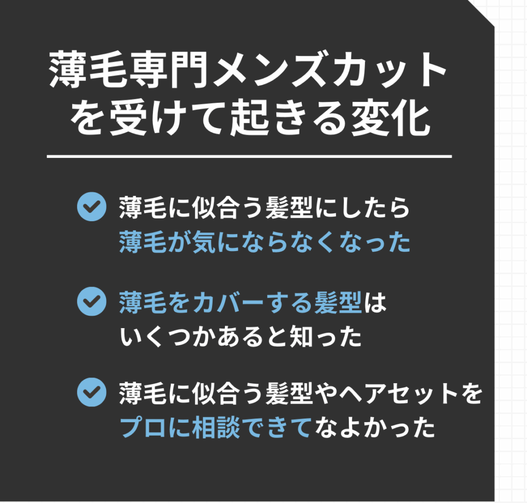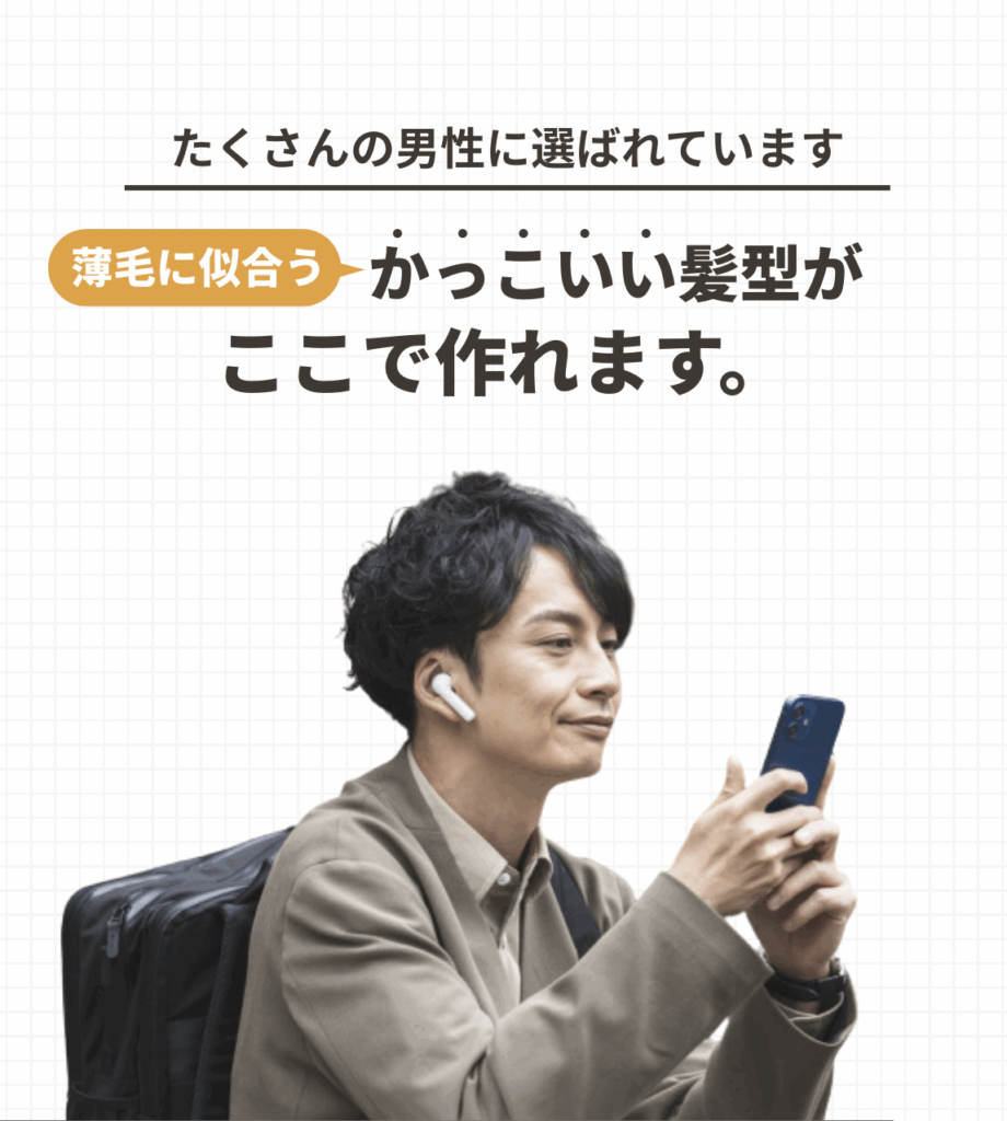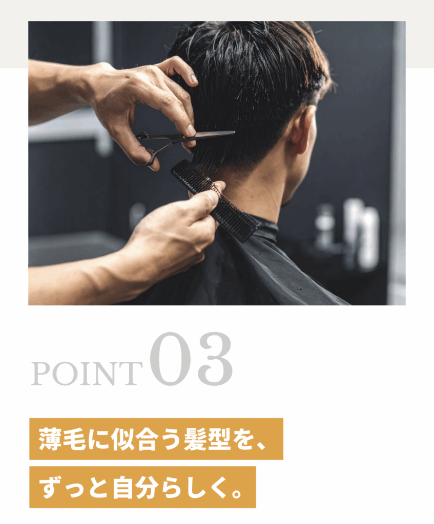薄毛男性のための清潔感を作りながら、今後の薄毛に似合う格好良い髪型をご相談いただけるコースです。薄毛と言ってもお客様ごとに特性や状況が異なりますので、お客様の特性や状況に合わせた薄毛対策の髪型のご提案とスタイリングを行います。