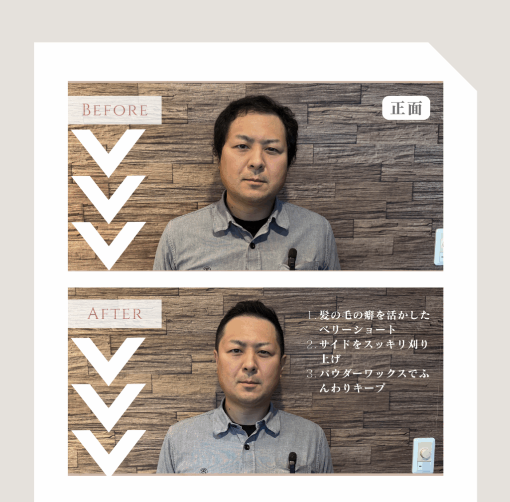 普段は前髪をあげる感じでヘアセットをしているのですが、今回は前髪にパーマをかけて前髪の毛量を増やしてもらいボリュームを出してもらうことで、M字薄毛の部分が目立たないようにしてもらいました。トップの方は少し短く切ることでボリュームがでるということでお願いしました。アップバンクショートという髪型とのことでした。