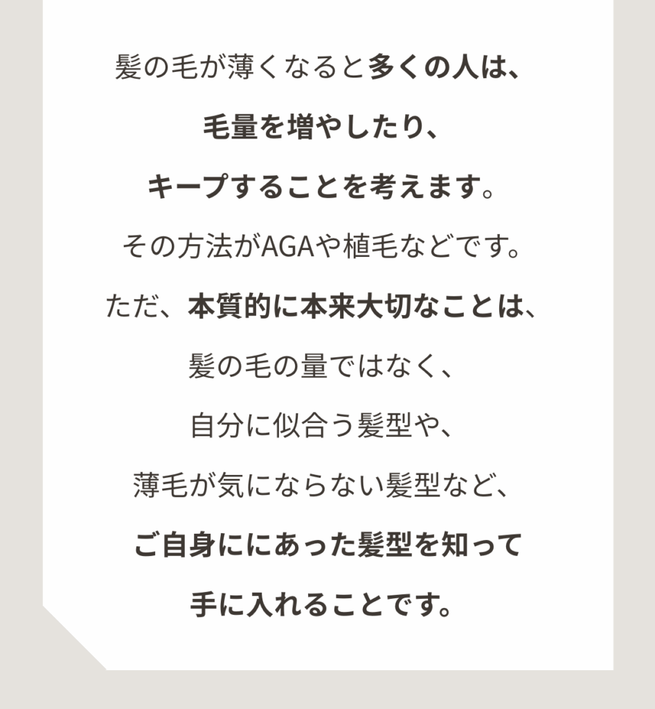 「悩みを知り尽くしたユーザー視点」と「魅力を引き出すプロの技術」。この二つの知見を凝縮した独自のスタイリングで、お客様の悩みを自信へと変え、新しい魅力を提案します。