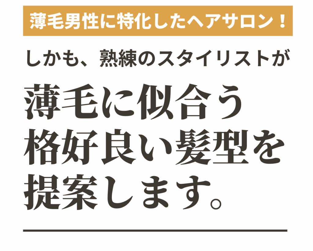 オーナーが若ハゲになった頃、色々な美容室や理容室で薄毛の相談をした時に、ちゃんと応えてくれる美容室・理容室がなかったことから、日本全国で薄毛メニューを扱っている店舗をまわりながら、最高のメニューを取り揃えています。代表の佐々木を筆頭に薄毛男性に特化した、薄毛に似合う髪型や薄毛を目立たなくする髪型を研究し続けています。