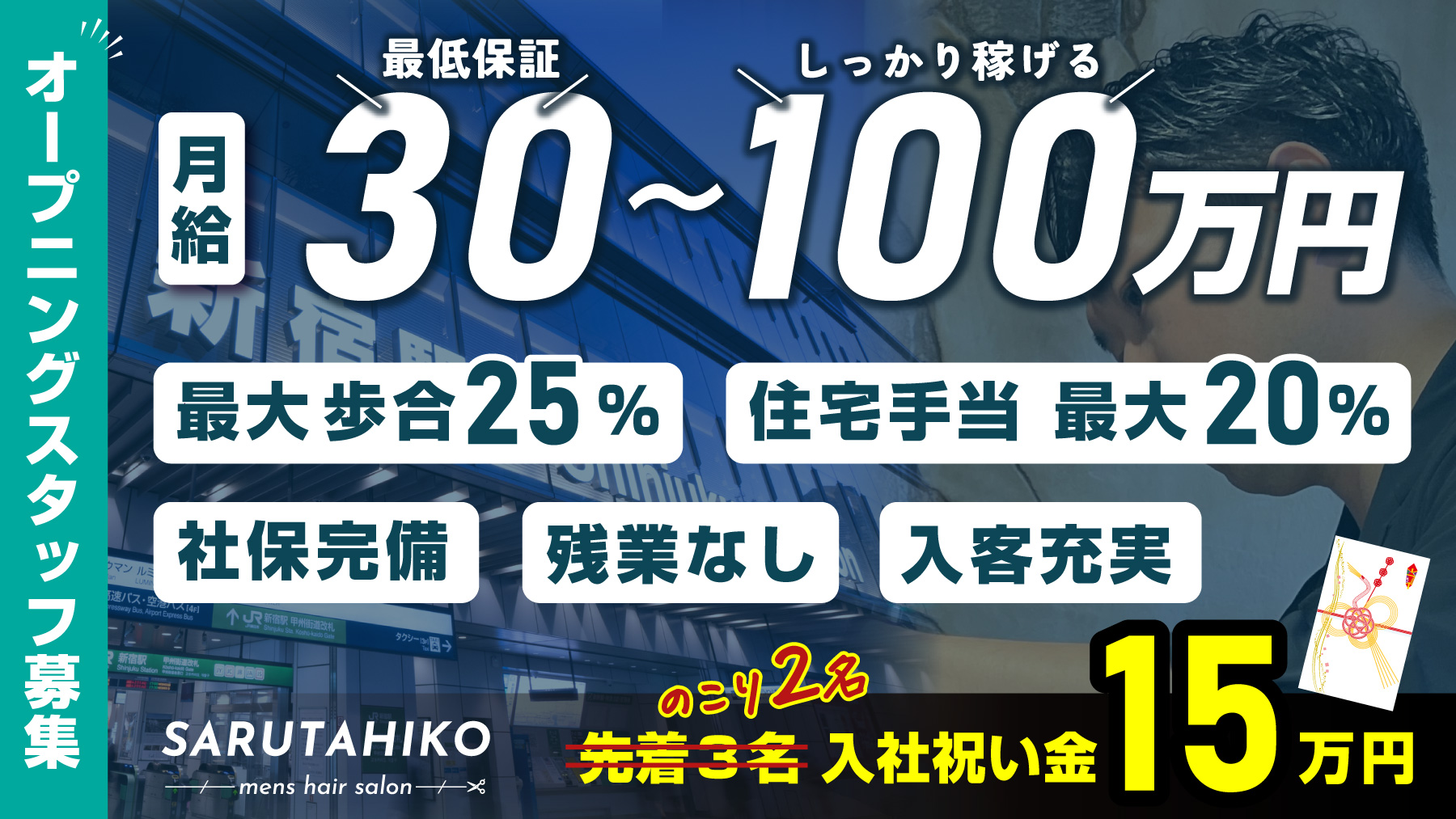 | SARUTAHIKOで働く魅力 | ・全席個室対応で顧客満足度重視 ・休日の講習残業は一切なし ・評価制度が明確にあり、風通しの良い職場環境 ・薄毛カットが 未経験・ブランクありでも安心 ・丁寧なマニュアルと研修制度で安心スタート ・理容業界の“第2ステージ”としてのキャリア形成が可能 ・様々なキャリアアップ形成の選択肢 (カット技術特化型・マネジメント.教育特化型・商品開発特化型など) ・社内ベンチャー制度による新事業責任者 ・社内独立制度もあり |