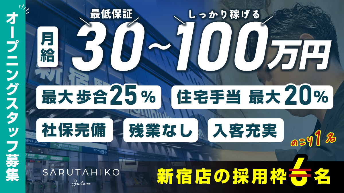 | SARUTAHIKOで働く魅力 | ・全席個室対応で顧客満足度重視 ・休日の講習残業は一切なし ・評価制度が明確にあり、風通しの良い職場環境 ・薄毛カットが 未経験・ブランクありでも安心 ・丁寧なマニュアルと研修制度で安心スタート ・理容業界の“第2ステージ”としてのキャリア形成が可能 ・様々なキャリアアップ形成の選択肢 (カット技術特化型・マネジメント.教育特化型・商品開発特化型など) ・社内ベンチャー制度による新事業責任者 ・社内独立制度もあり |